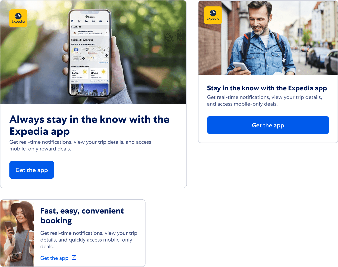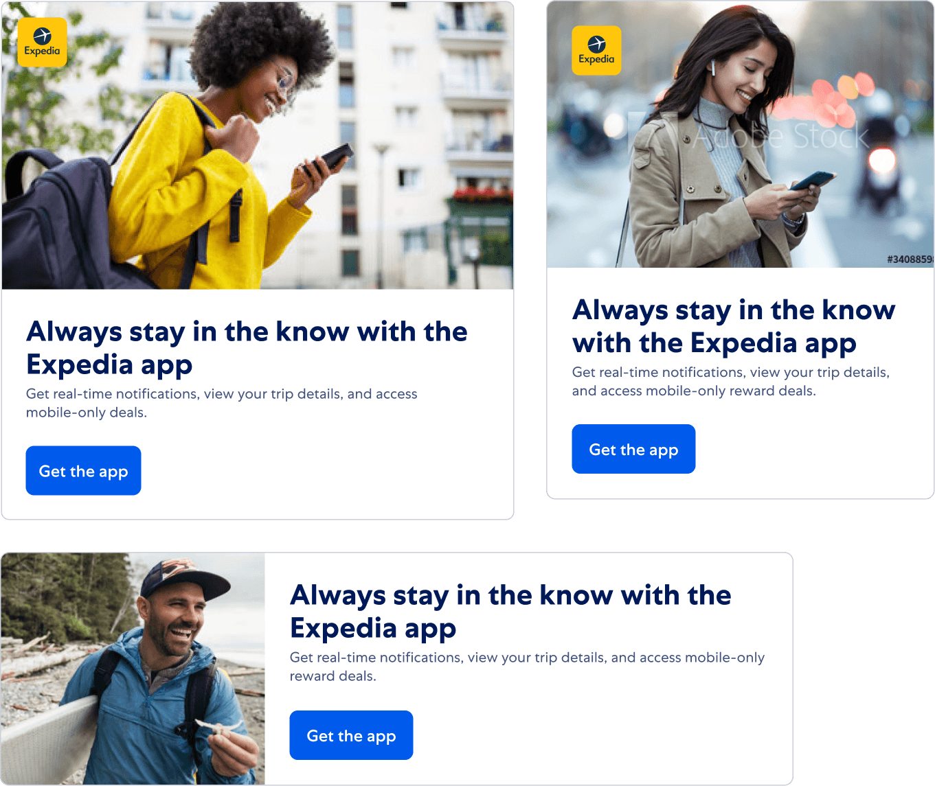 MAD is a suite of UI components strategically designed to drive global app downloads, adoption, and usage. They incorporate regionally personalized messaging, imagery, and placements, enhanced through user testing and machine learning. Distributed across various locations on the Expedia website, placement decisions factor in the guest's stage in the user journey and their global or regional market. Additionally, placements are tailored to harmonize with surrounding content, with intrusiveness calibrated on a scale tied to market performance and cultural relevance. Rigorous testing covers all placement content elements, including images, CTAs, value propositions, placement types, and locations.