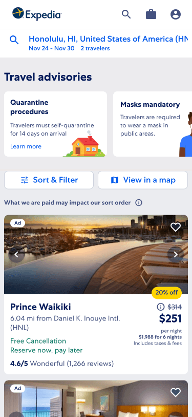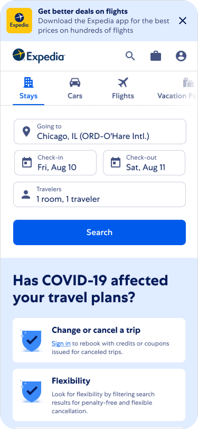 The redesign I implemented aimed to unveil more of the Expedia homepage real estate, providing access to top-of-the-page key actions for users uninterested in the newly named "App-Hero" content.