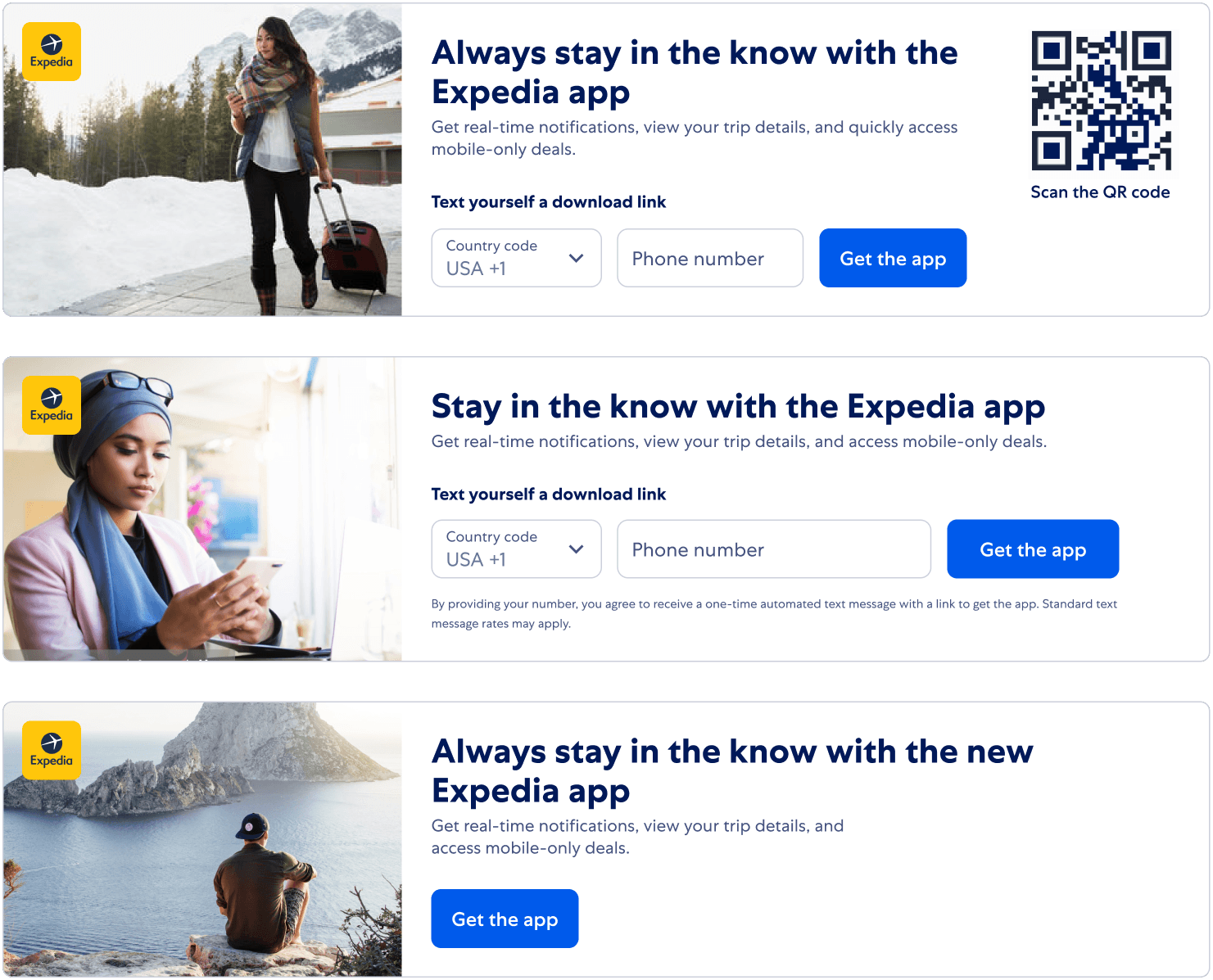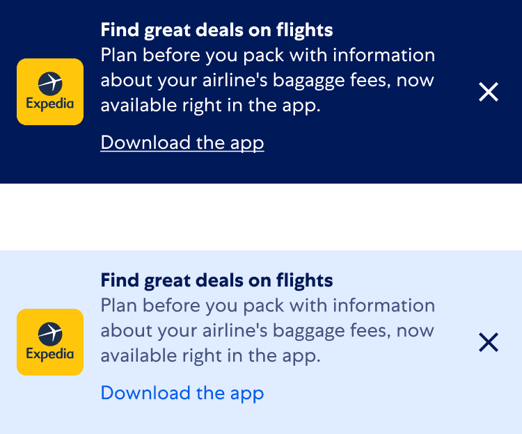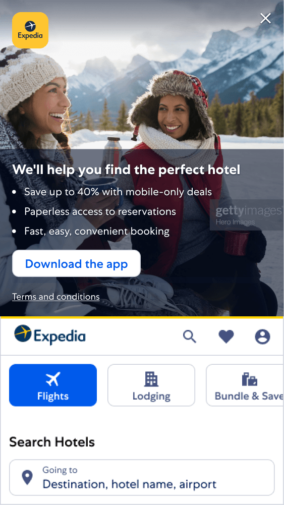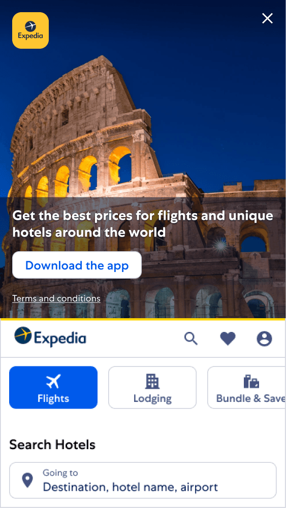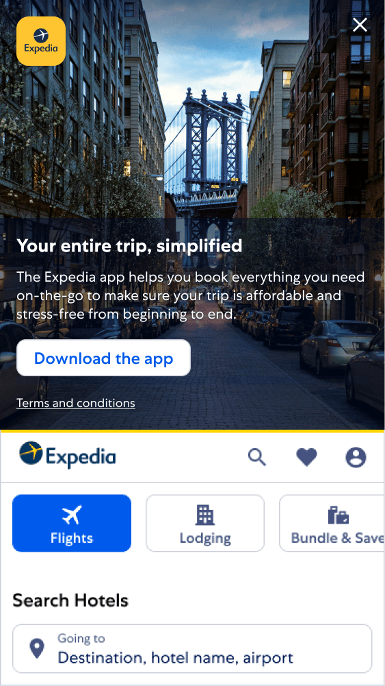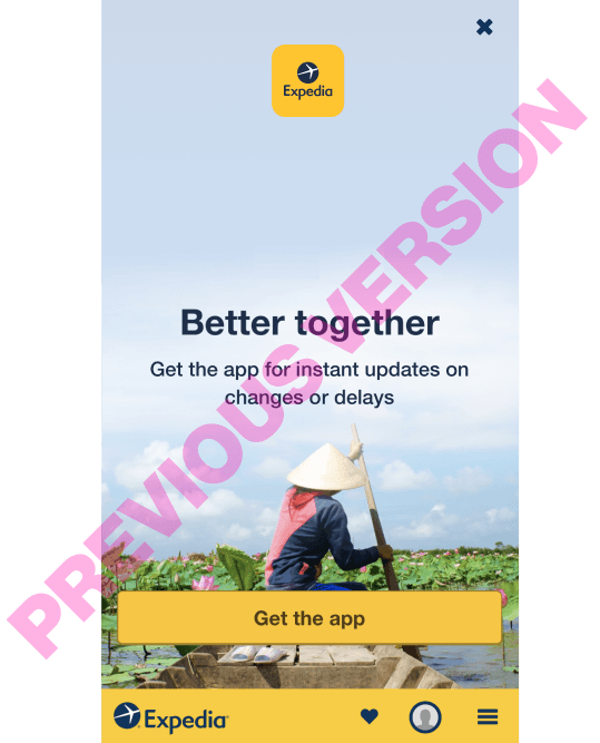 The Marquee was a redesign of a previous Expedia footer that lacked any branding. Positioned towards the bottom of the site, it is presented to users with a reduced likelihood of downloading the app.