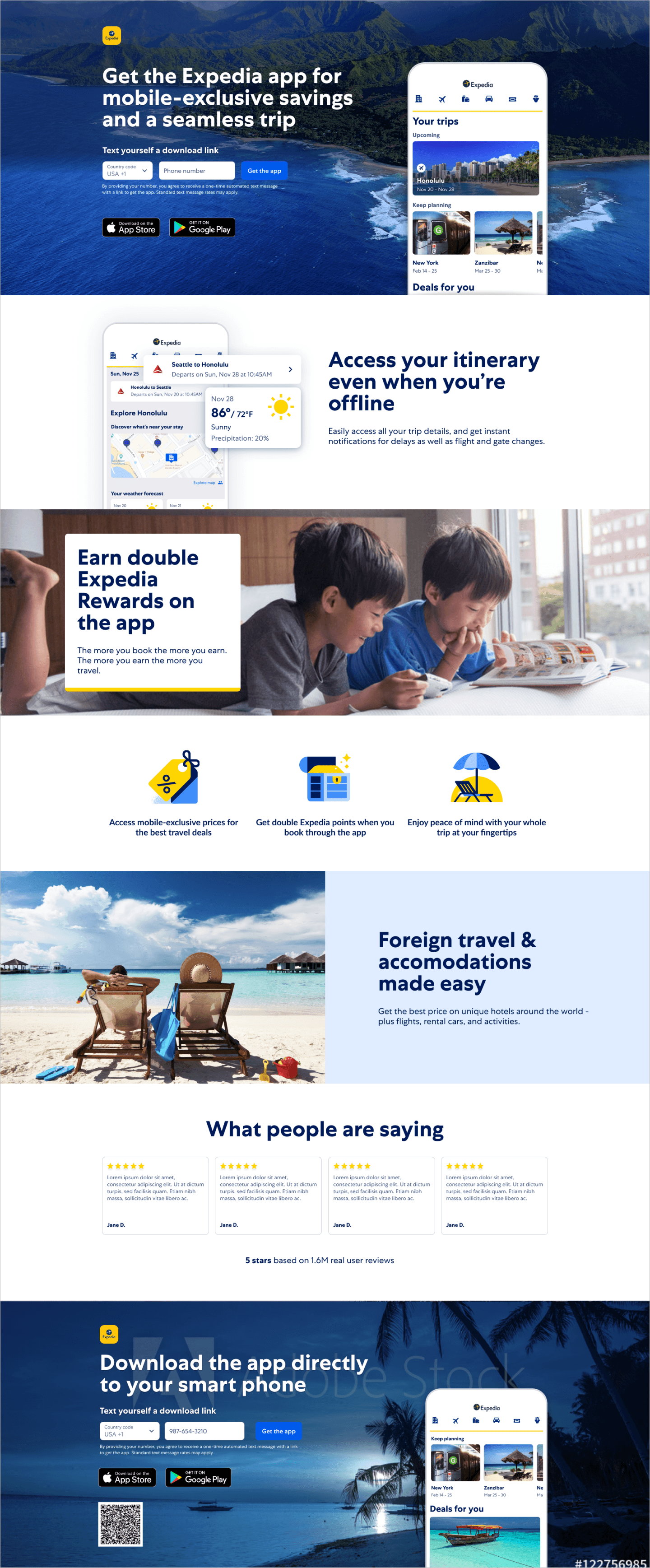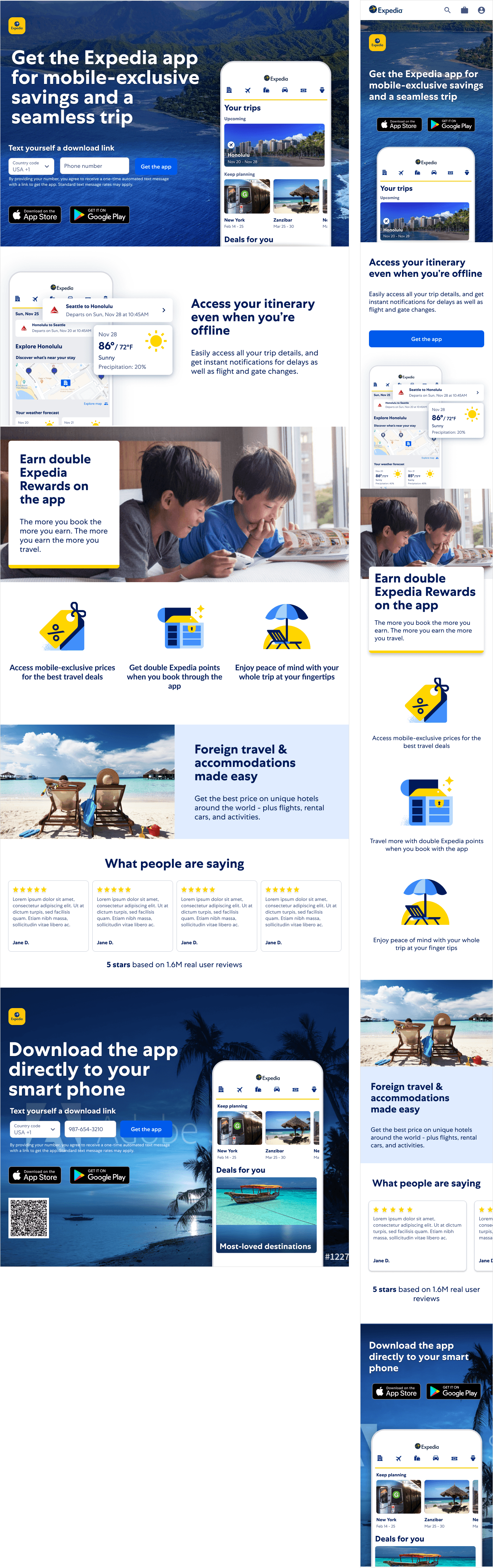I played a key role in various web and app projects at Expedia, primarily focusing on global Mobile App Downloads (MAD). During my time there, I had the luxury of collaborating with a UX Research team, a well-organized and governed Design Systems team, thoughtful Devs, and a dedicated UX Writer. Despite the challenges posed by the pandemic, which notably affected the travel industry, our unit successfully sustained its performance and maintained our download numbers. Take a look at the specifics of the work below.